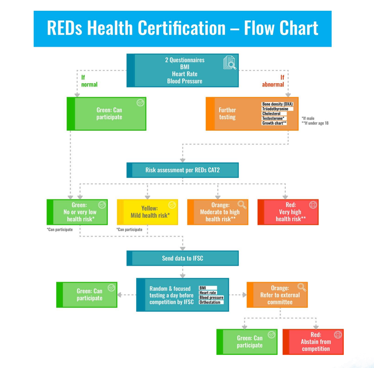 La nouvelle politique de l’IFSC exige donc que divers points de données de chaque athlète soient pris en compte pour évaluer leur santé. Un travail en étroite collaboration avec les fédérations nationales chargées de collecter les informations médicales. Ainsi, pour recevoir leur licence internationale annuelle d'athlète, condition de participation à tout événement organisé par l'IFSC, les athlètes doivent désormais soumettre deux questionnaires (l'un portant sur le syndrome RED-S et l'autre sur les troubles du comportement alimentaire) et fournir leur taille, leur poids, leur IMC, leur fréquence cardiaque et leur pression artérielle.