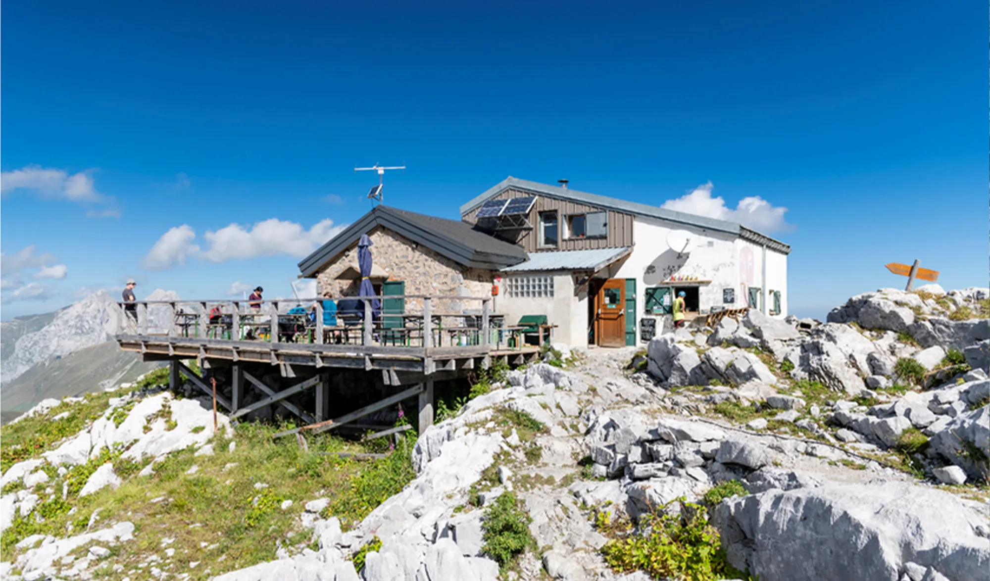Fruit d’une rénovation sur plusieurs saisons, le refuge de la Pointe Percée – Gramusset, situé sur la commune du Grand-Bornand, en Haute-Savoie, accueille randonneurs et grimpeurs de tous âges au milieu d’un environnement très minéral aux nombreux lapiaz, formations rocheuses karstiques très caractéristiques des préalpes que l’on doit au ruissellement des eaux. Au programme : vue sur le mont Blanc et les Aravis mais surtout de magnifiques couchers de soleil face à la chaîne du Bargy et au pic de Jalouvre (2438 m). Pour les plus grands, et les plus aguerris, c’est également le terrain propice à l’apprentissage de l’alpinisme, avec notamment l’ascension de la Pointe Percée (2752 m), point culminant de la chaîne des Aravis, via l’Arête du Doigt.