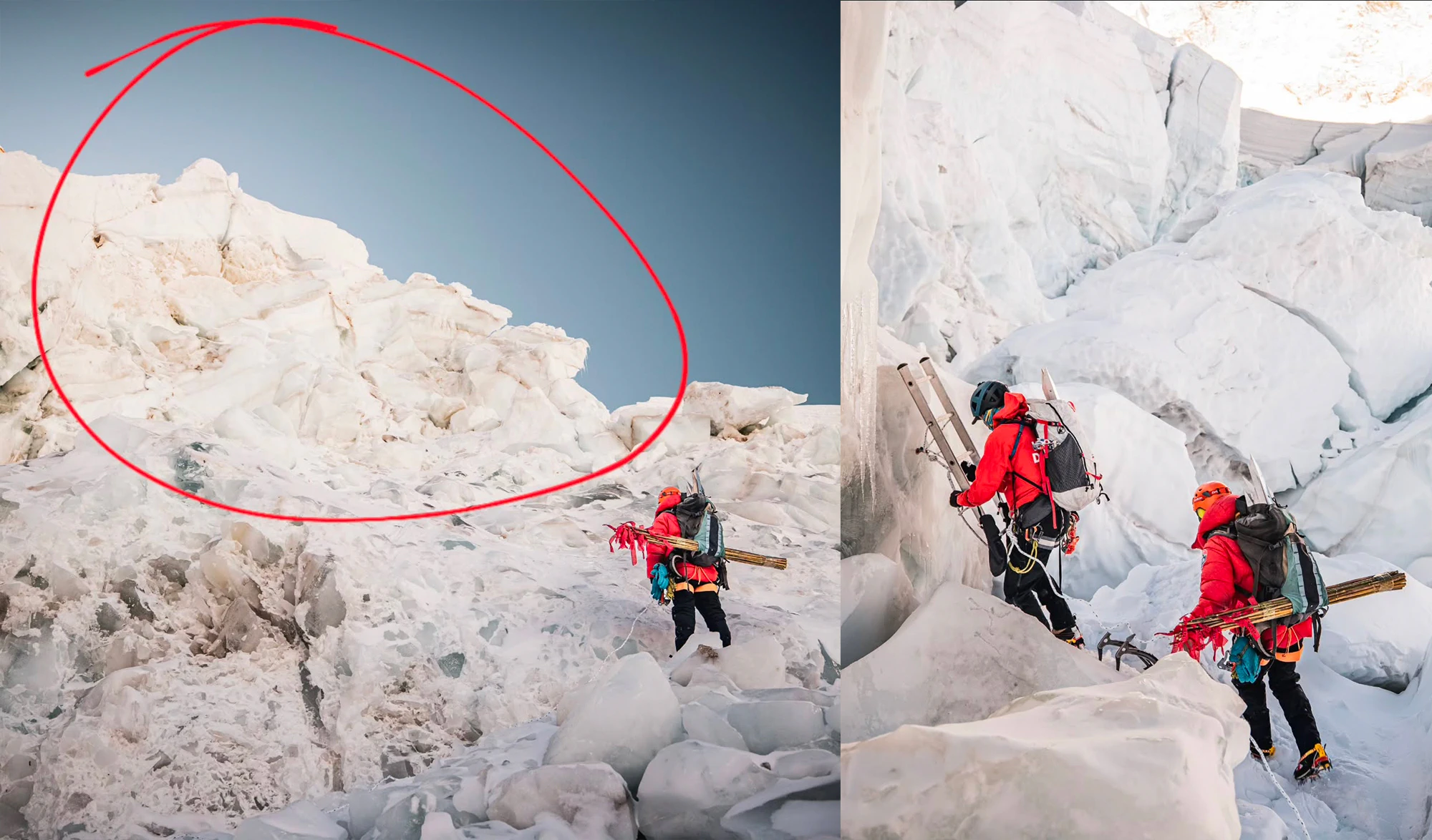 C’est là qu’interviennent chaque année les Icefall Doctors, une équipe d’experts népalais chargée de tracer et sécuriser l’itinéraire, en y installant des cordes fixes, des échelles métalliques, des pitons et des broches à glace. Mais cette année, l’opération s’est enrayée dès le départ. En cause : un sérac de 30 mètres de haut, perché directement au-dessus de l'itinéraire habituel, dont l’effondrement potentiel menaçait quiconque qui se serait engagé en dessous.