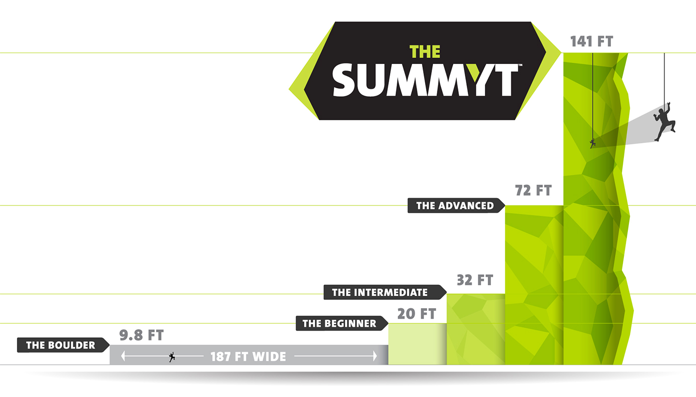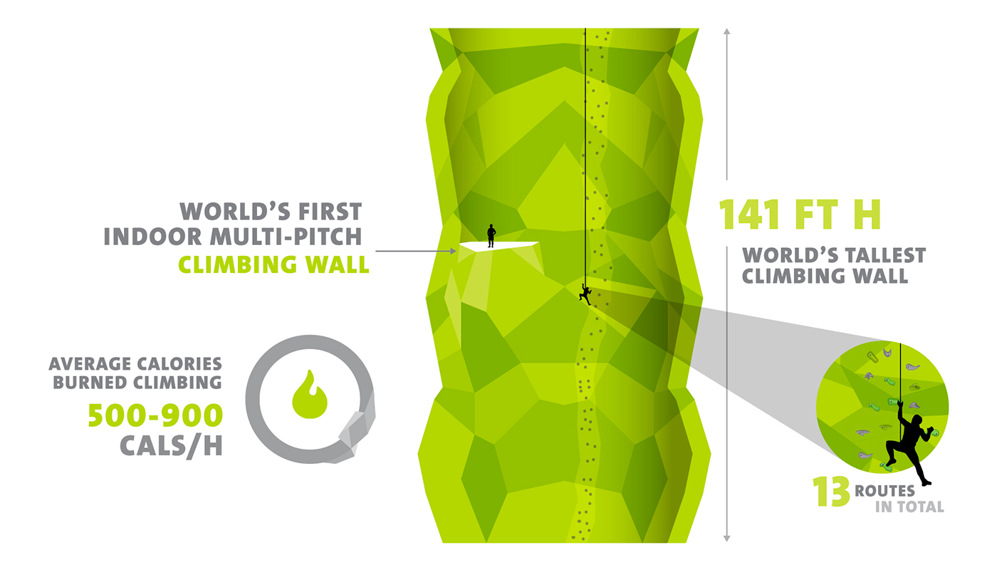 On y retrouve notamment cinq murs d’escalade, de différentes tailles, pour tous les niveaux. Mais celui qui fait sensation est baptisé “The SUMMYT”, 43 mètres de hauteur, le plus haut jamais construit en salle. Mais au-delà de sa taille impressionnante, il propose 13 voies différentes, ainsi que des plateformes pour assurer les relais. Une séance de 90 minutes vous sera facturée 24 €, relativement cher si l’on compare aux 15 € que coûte celle, sans limite de temps, d' Arkoze par exemple, même si évidemment, les infrastructures ne sont pas équivalentes.