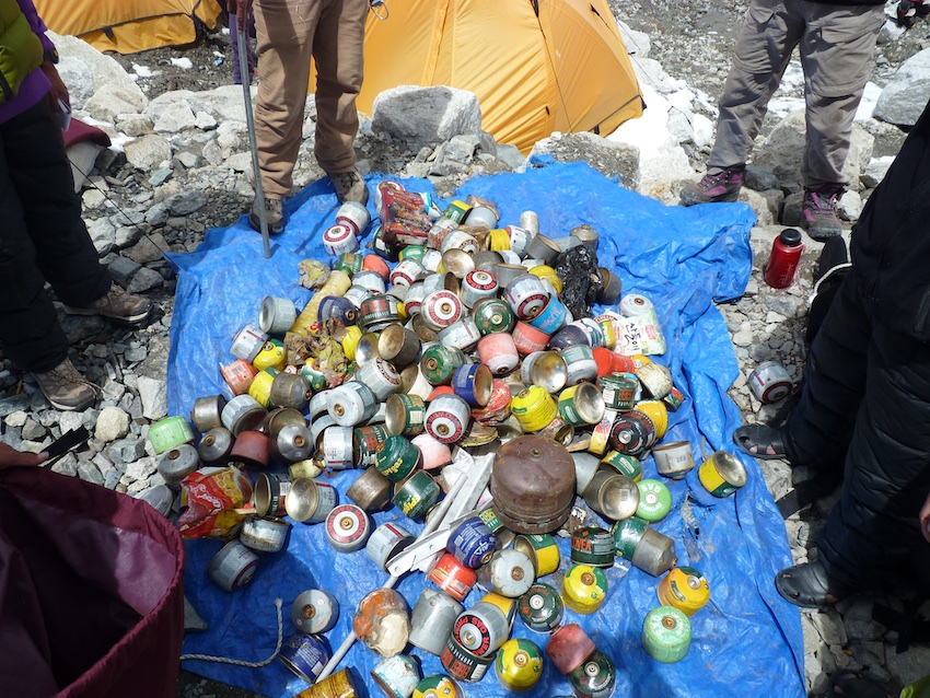 Tout d’abord j’y ai acquis une équipe. Sensiblement la même cette année qu’en 2010. Une vingtaine de personnes au total, dont le chef d’expédition, un Sherpa qui a déjà fait 7 fois l’Everest. Sur le camp de base, les déchets sont ramassés à la main, parfois même à la petite cuillère. On trouve de tout, des bouts de cordes, des tentes, des duvets et beaucoup de bouteilles de gaz et d'oxygène, jugées inutiles par les alpinistes, une fois vides. Tout est redescendu à dos d’hommes. Impossible d’opérer autrement, à 5500 mètres, les hélicos ne passent plus.