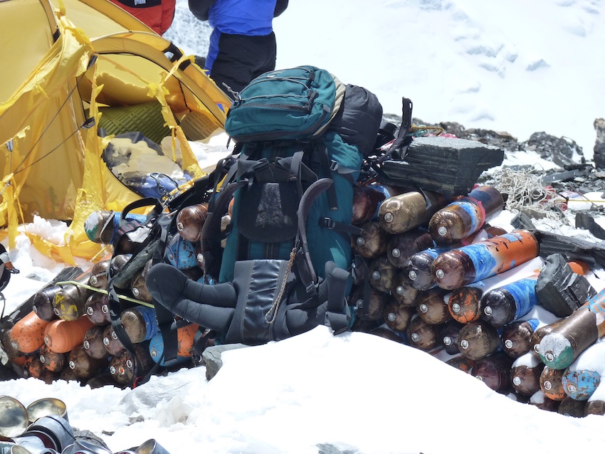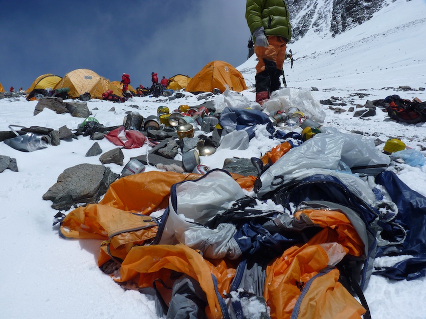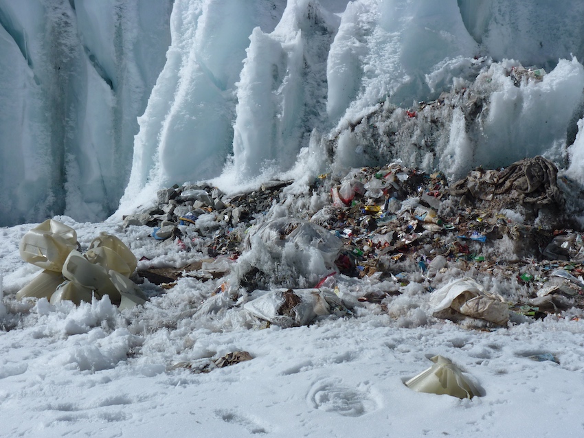 On évalue à 100 tonnes environ les déchets accumulés sur le massif de l’Everest. C’est une estimation peu précise, il n’y a pas de relevé exact, mais elle donne une idée du problème, certains déchets, émergeant de la glace avec la fonte des glaciers remontant à 1920 …