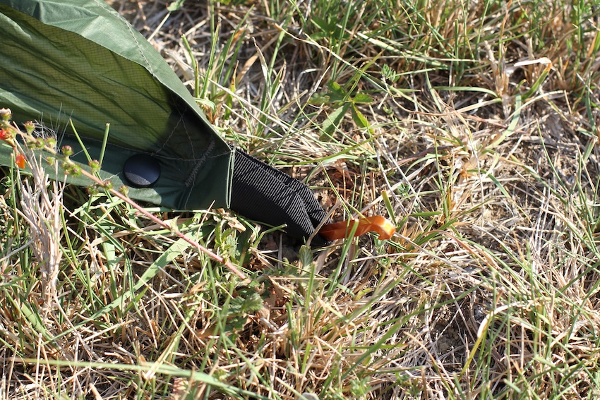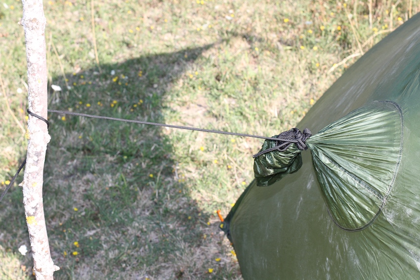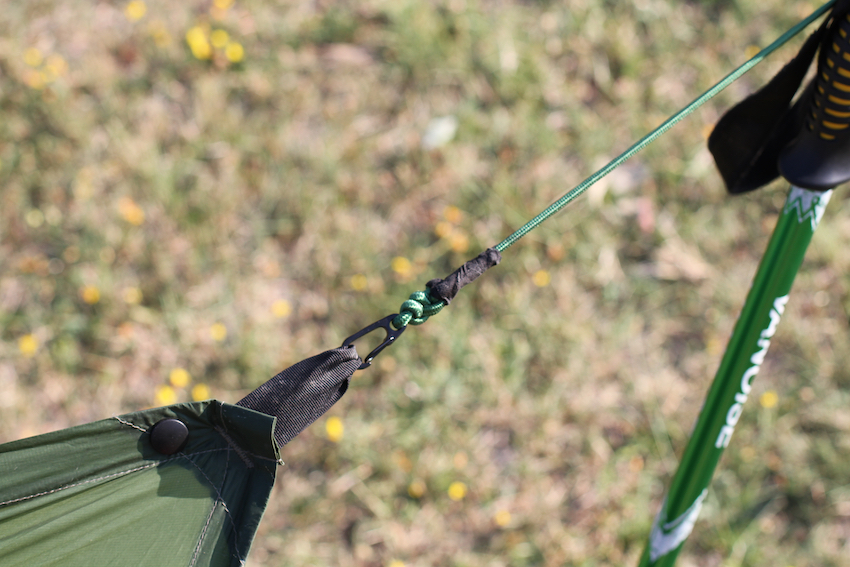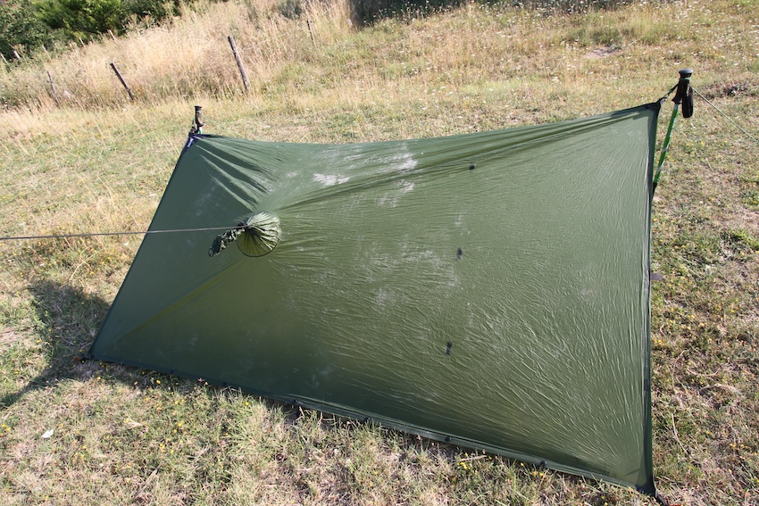 Le poncho, de son côté, peut être tendu en appentis, avec deux bâtons de rando (ou n'importe quel support), ce qui protège d'une petite pluie sans problème, et permet de couper le vent sur un côté. On peut aussi le tendre en "poulpe" : 4 ancrages au sol, tous plus ou moins à la même hauteur. Le poncho est alors surélevé par le capuchon tirant vers le haut, en son centre. On peut le surélever soit en tirant une ficelle sur une branche ou un point haut, au-dessus, on en plaçant ses bâtons de rando à l'intérieur, comme des mats, piqués dans le sol.