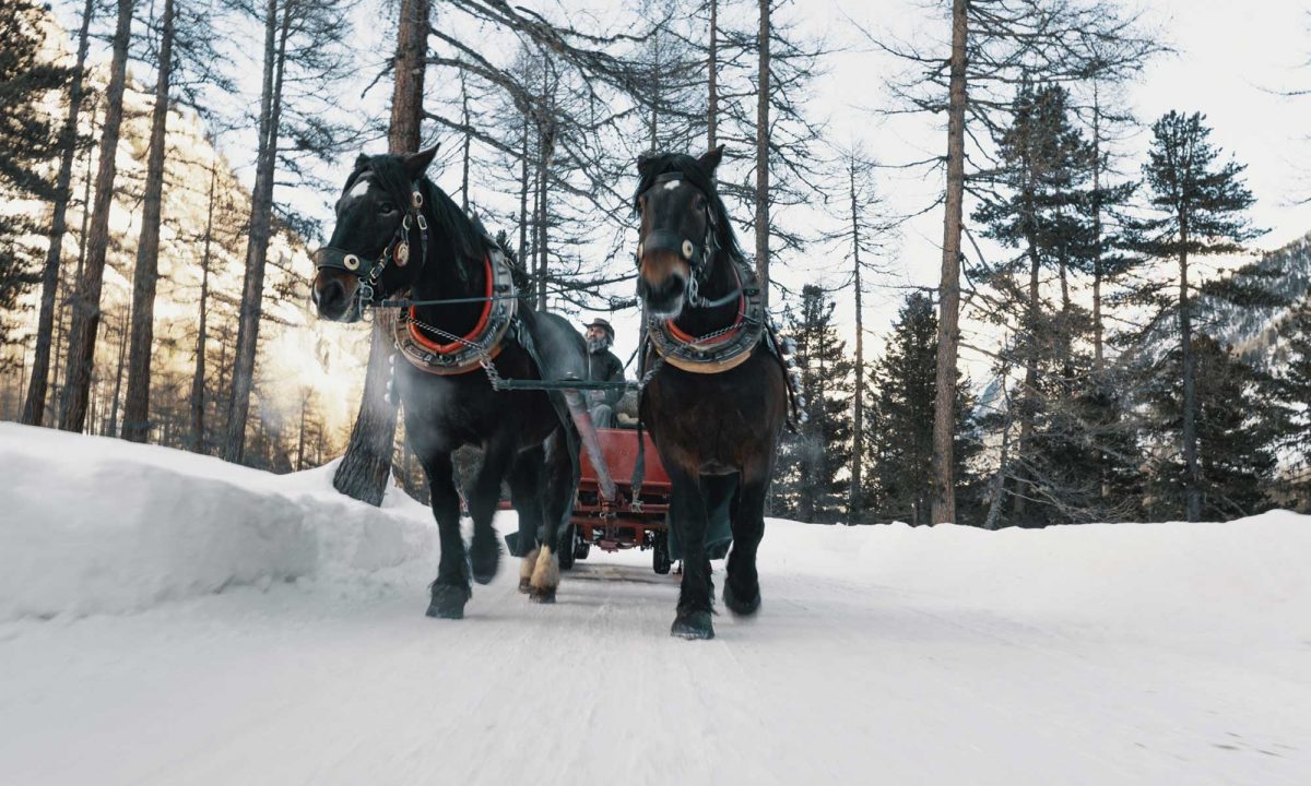 C’est tout naturellement que Wohli a repris l’une des plus anciennes traditions de la région : l’attelage, en traineau ou calèche. Debout dès l’aube, toujours suivi de son chien Juma, le meneur commence et termine immanquablement sa journée par un tour d’inspection de ses chevaux. A chacun, une caresse et un encouragement avant de se mettre au travail dans des conditions parfois extrêmes. « En hiver, la température peut descendre en dessous de moins 20 degrés », explique Wohli. « Mais on ne doit pas s’empêcher de sortir pour autant. Au contraire, l’atmosphère devient encore plus mystique. » Fendre l’air glacé chaudement installé sous une couverture, semble en effet réjouir les visiteurs faisant une pause entre deux sorties de ski. Leur traîneau emprunte une petite route le long de l’Ova da Roseg, en direction de la vallée. Un paysage spectaculaire de forêts de pins et de mélèzes enneigés. « Avec un peu de chance, on peut même voir des chamois et des cerfs sur un traîneau », raconte Wohli.